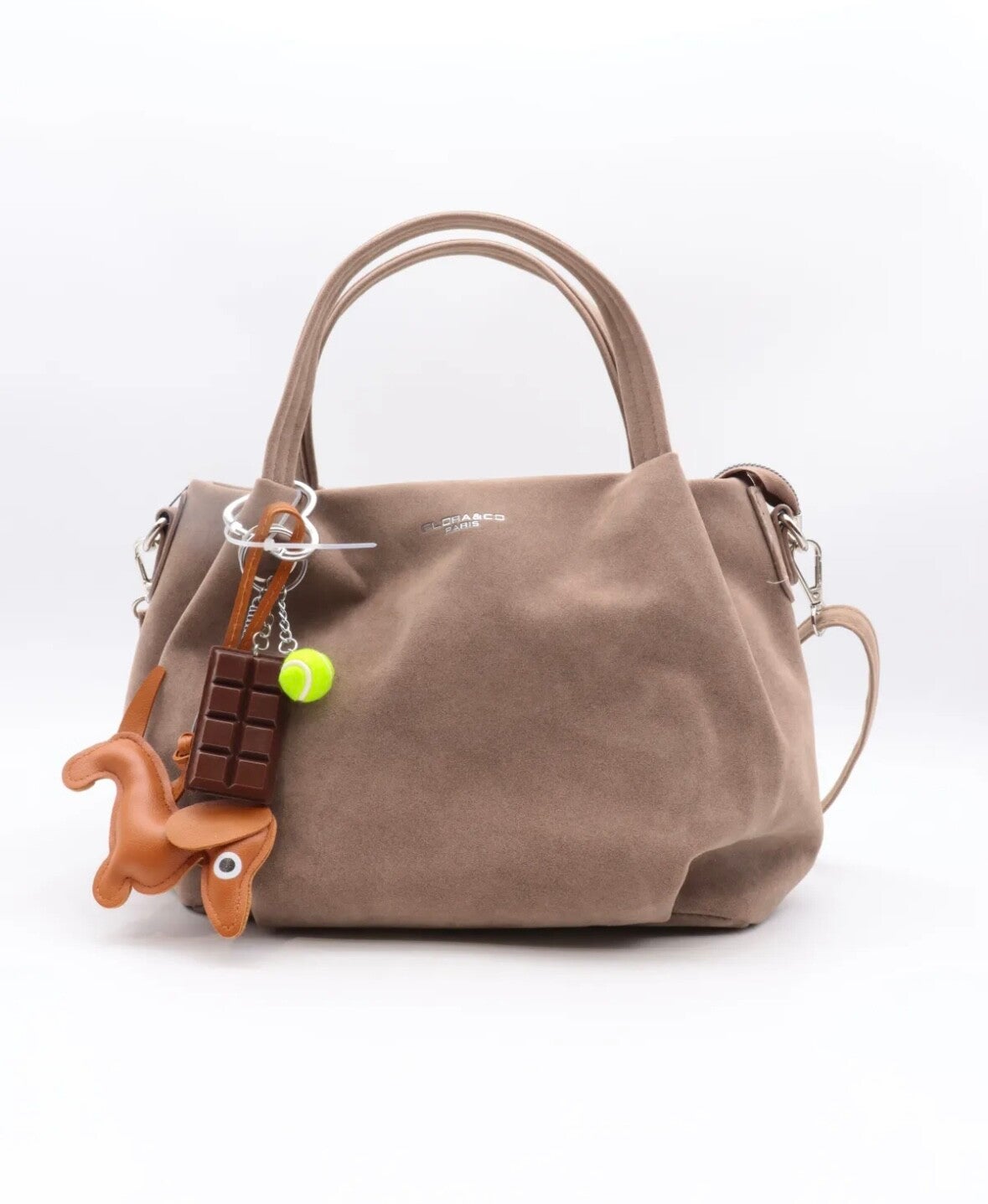 effet suédine souple et spacieux. Bandoulière amovible pour un porté épaule ou croisé. Orné de pompons et porte-clés décoratifs Intérieur doublé avec compartiments zippés pratiques.