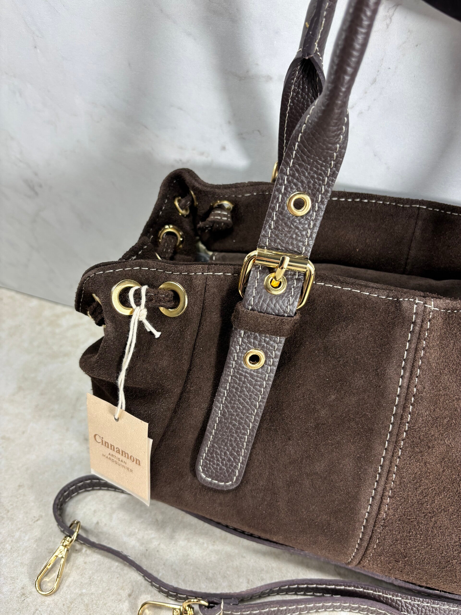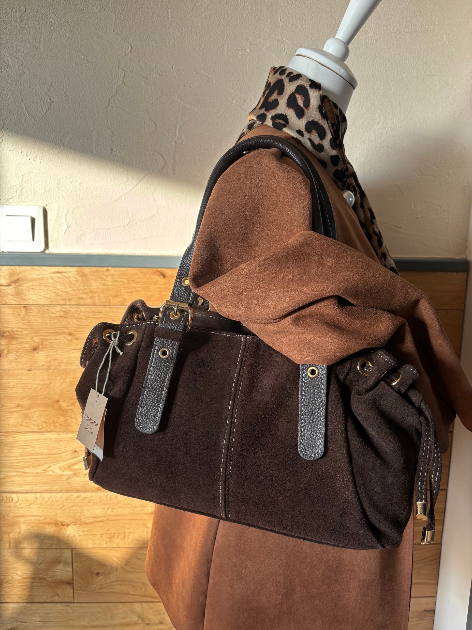 Sac cuir chocolat en daim bandoulière chic élégant miniprix tendance double compartiment